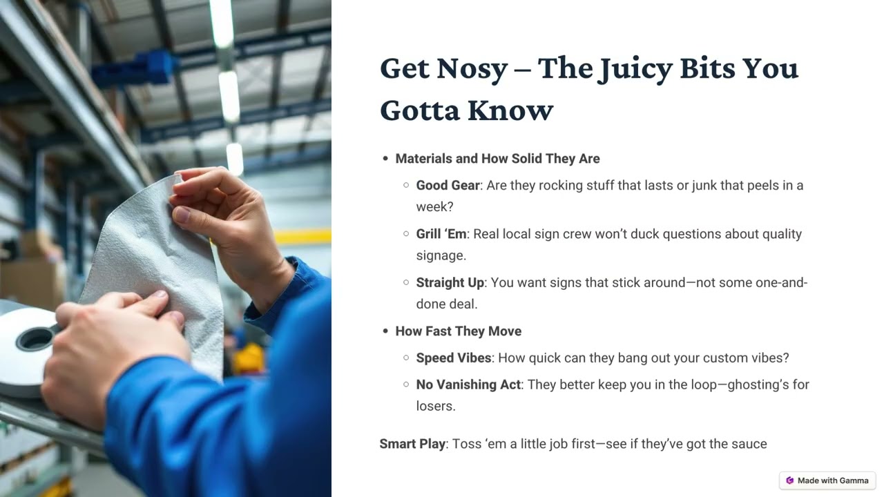 3. Listen to the GrapevineCustomer reviews are gold. They spill the tea on what it’s really like to work with a place. Folks like Alicia Gabra and Donna Pontoriero have shouted us out for killer custom signage and just being easy to deal with. Scroll through some feedback to see who’s legit.